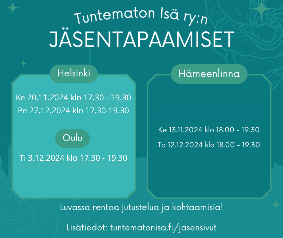 Jäsentapaamiset ovat kaikille yhdistyksen jäsenille avoimia kohtaamisia, joissa on mahdollisuus tavata muita yhdistyksen jäseniä rennon jutustelun merkeissä. Kohtaamisia järjestetään kolmella paikkakunnalla: Helsingissä, Hämeenlinnassa ja Oulussa (Helsingin ja Oulun loppuvuoden jäsentapaamisten ajankohdat tarkentuvat).