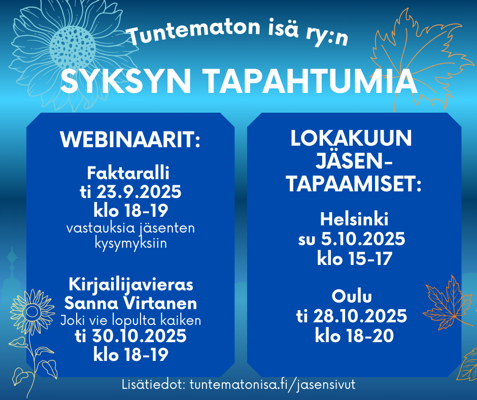 Ke 20.8. klo 18-19.30 Webinaari: Kirjailijavieras Mari Valonmeri: Salattu toivottu lapsi Su 24.8. klo 15-17 Jäsentapaaminen: Helsinki Ti 26.8. klo 17-19 Jäsentapaaminen: Lappeenranta Ti 26.8. klo…