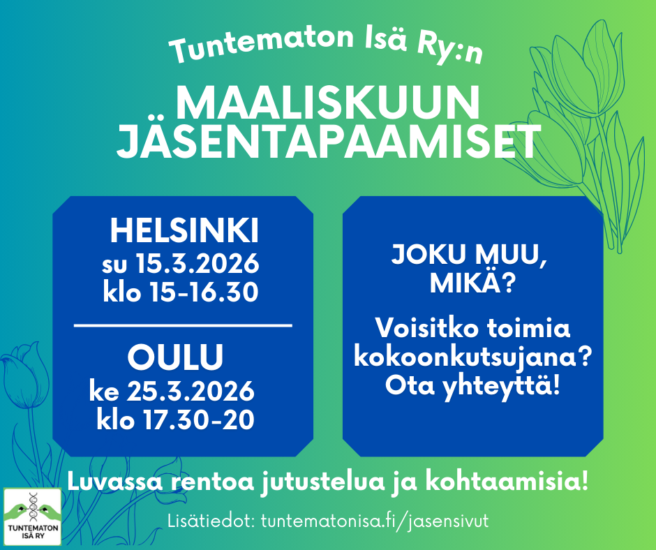 Kuuntelua ja puhumista aiheesta OMA ISÄNI – TUNTEMATON. Vertaisryhmä Tuntematon Isä ry jäsenille, joiden oma isä on tuntematon. Aika torstaisin klo 18.00 – 19.30 etänä (Google Meet) Kokoontumiskerrat:…